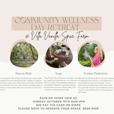 We invite you to join us on a journey of Self healing, for a beautiful day immersed in nature at the Villa Vanilla Spice Farm. Explore the property, mindfully walking among the lush rainforest and biodynamic farm.